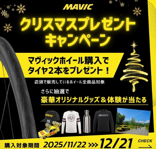 期間中、MAVIC正規販売店でMAVICホイールを購入された方に豪華クリスマスプレゼントをお届けするスペシャル企画がスタートしています 。