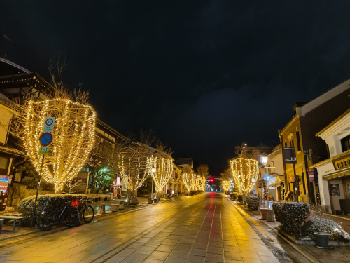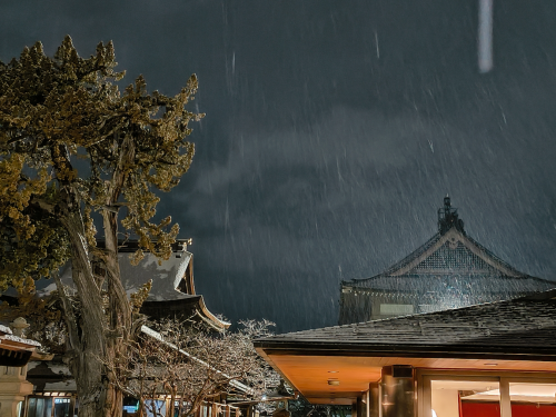 雪が降る中、生粋の自転車好きに誘われて夜の善光寺へ。シミズです。