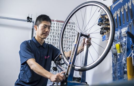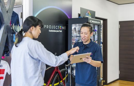 トレックストアでは、最高位の資格を持つメカニックがメンテナンス作業を行います。作業中は店内の自転車やアクセサリーをご覧いただくのはもちろん、作業の様子を見学いただくのも大歓迎です。